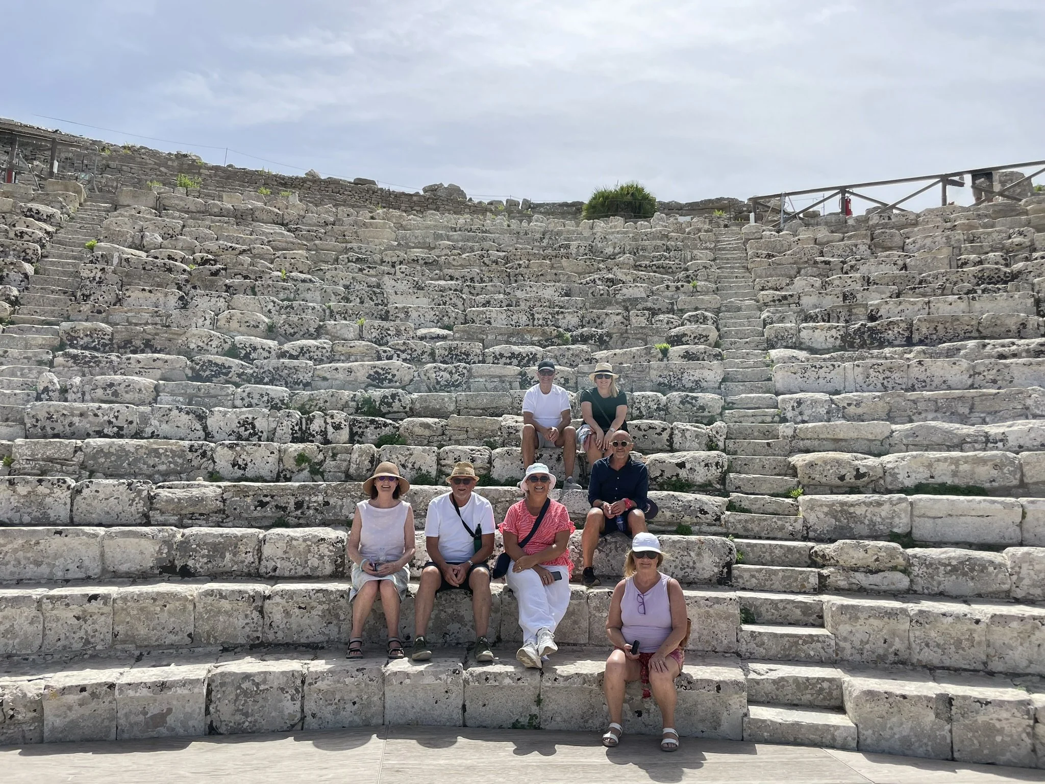 Group of seven tourists sitting on stone steps of an ancient outdoor amphitheater, some wearing hats and sunglasses, under a cloudy sky.