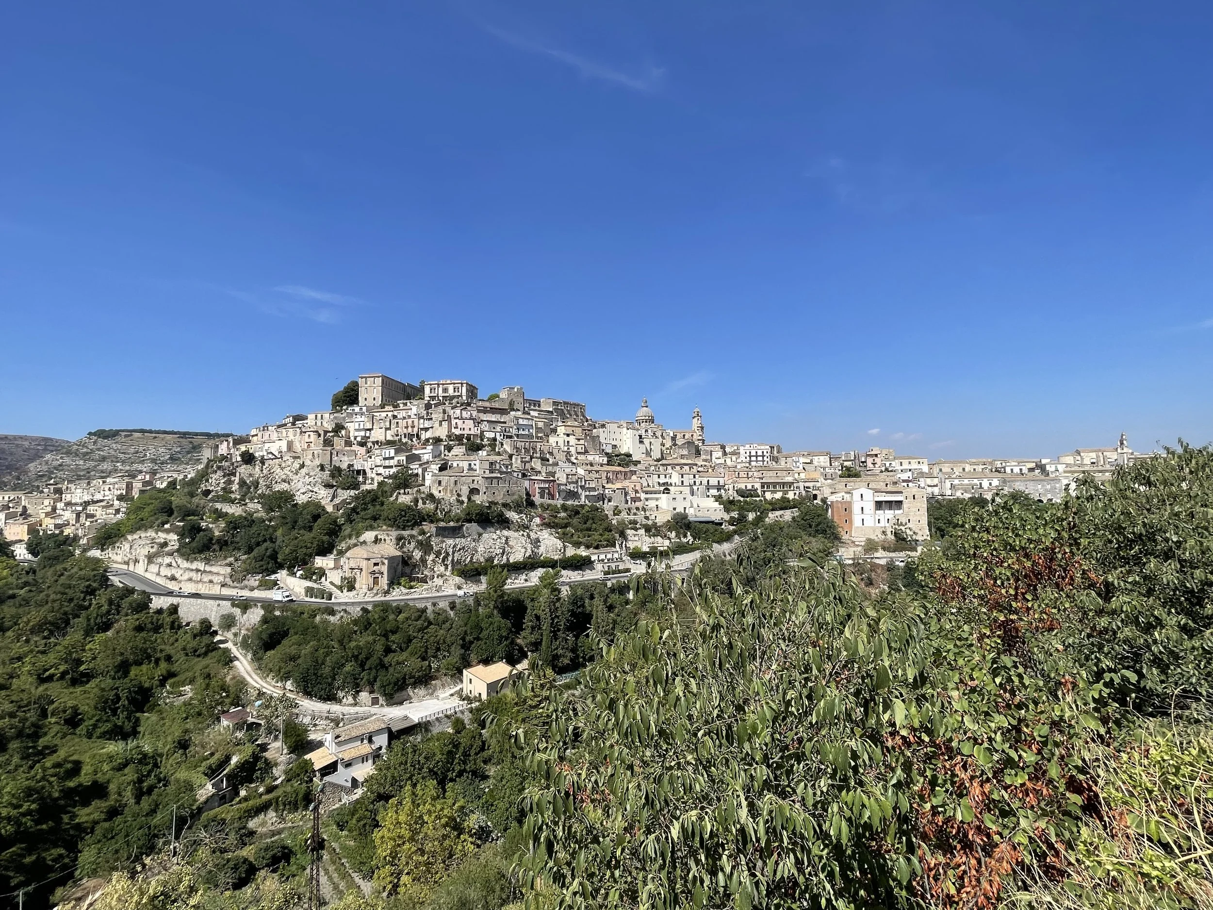 View of a hillside town with tightly packed buildings, with greenery in the foreground and a clear blue sky above.